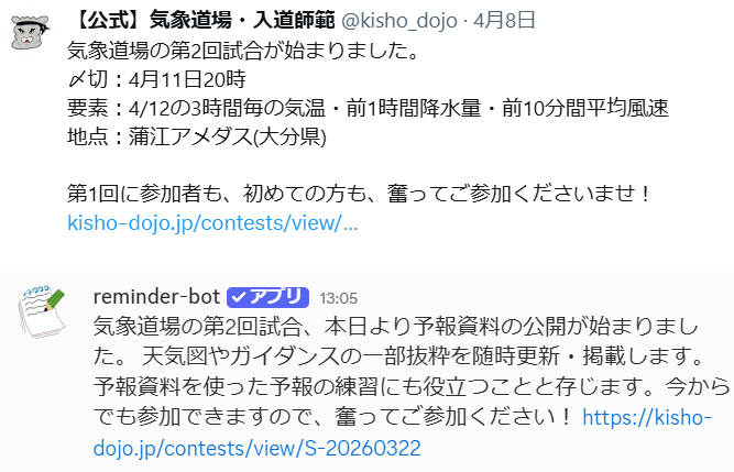 気象道場公式Xアカウントと、Discordサーバーにてコンテストのリマインダをお送りすることといたしました。